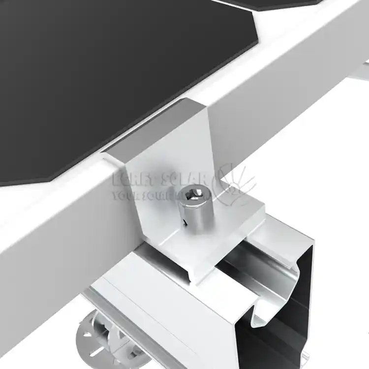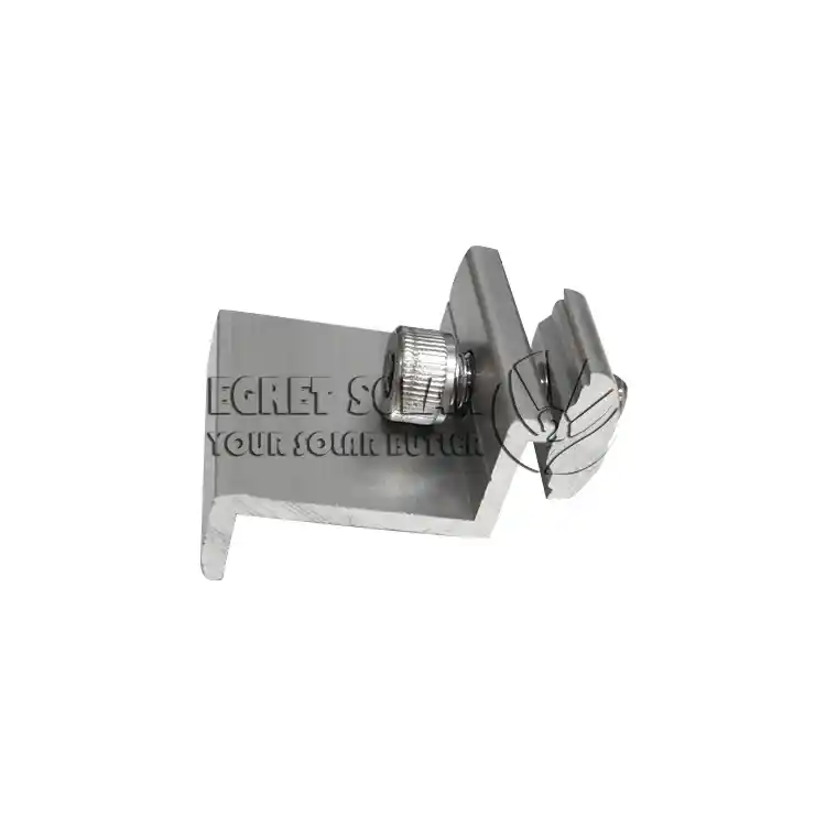 крайна скоба соларнафиксира рамката на най-външния компонент на всеки ред към края на релсата, за да предотврати изплъзването му. В същото време, натискането на краищата на компонентите помага за намаляване на нахлуването на вятър, дъжд и прах отстрани. Той е разположен на ръба на масива и директно понася най-силната повдигаща сила на вятъра (сила на издърпване нагоре) и сила на засмукване на вятъра. Това е ключова точка, носеща сила в устойчивия на вятър дизайн и трябва да има достатъчна механична якост.